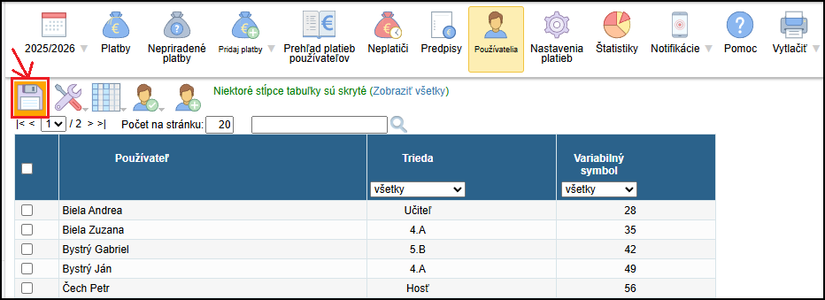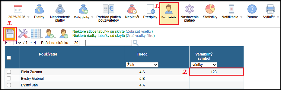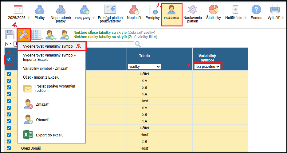 a. Vygenerovanie variabilného symbolu v EduPage urobíte v záložke Používatelia :