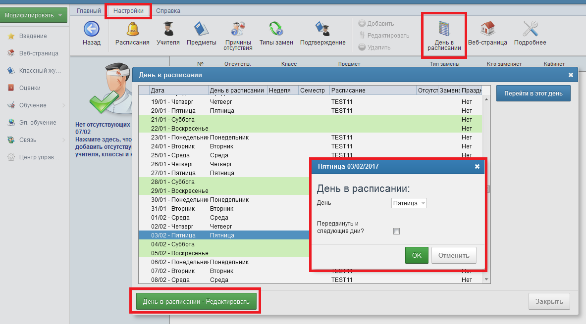 В Заменах в Интернете Вы можете изменить день / неделю / семестр аналогичным образом.