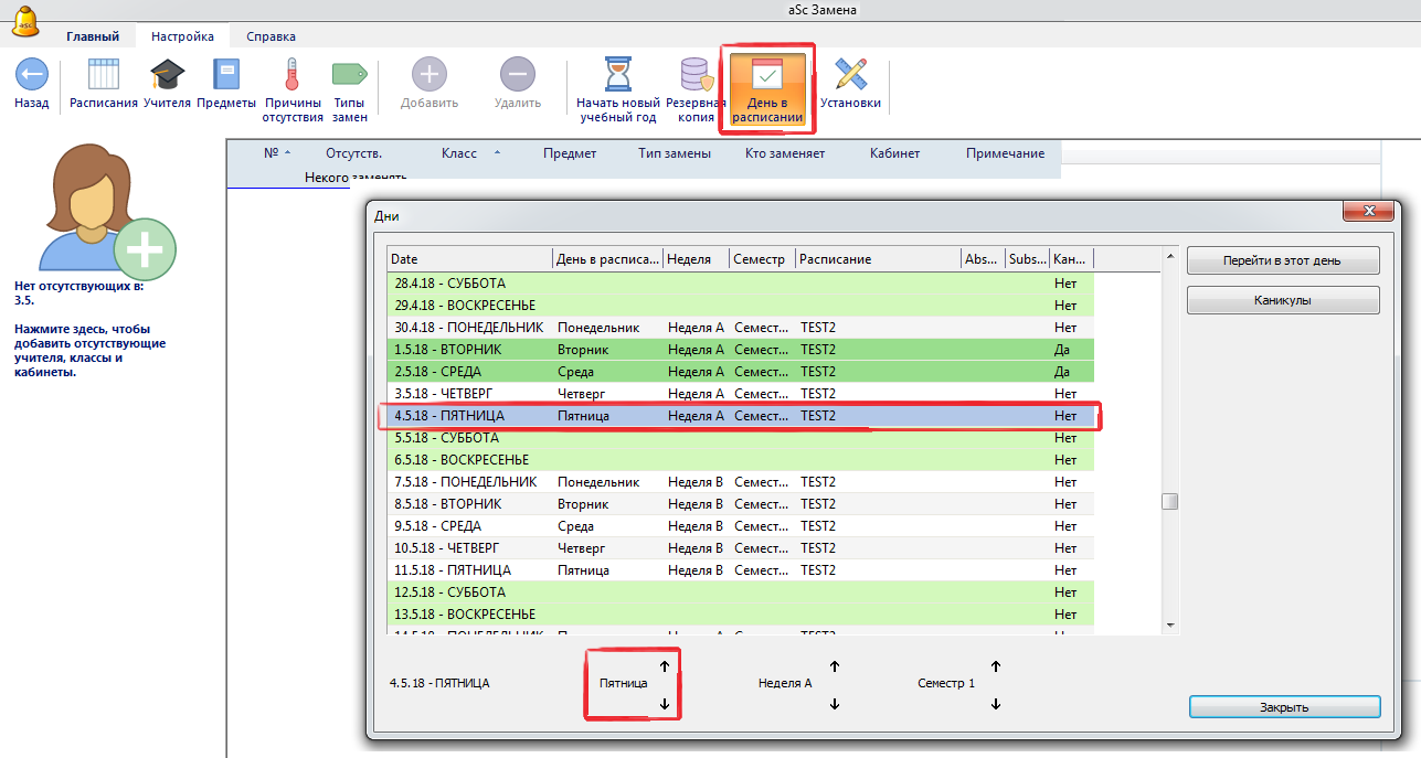 В программе Замены можно вручную изменить день (неделю / семестр). Этот день в расписаний затем используется для определения того, что должно быть заменено.