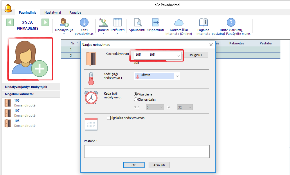 Lygiai taip pat, kaip nedalyvaujantys mokytojai, įrašomi ir užimti kabinetai (kurie yra tvarkaraštyje, bet dėl kokių nors priežaščių jais negalima naudotis):