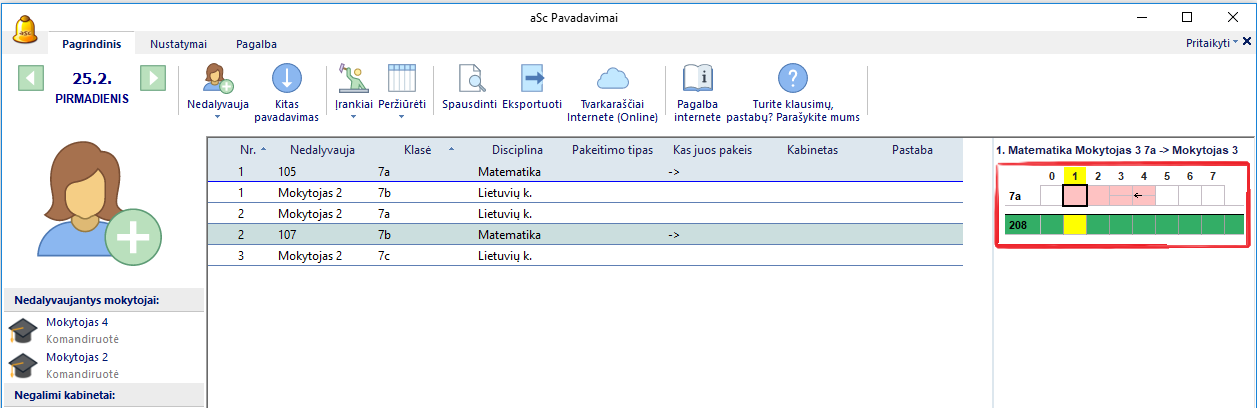 - sąrašo viršuje yra kabinetai, kuriose gali būti pamoka. Gali atsitikti, kad kai kurie užimti kabinetai yra aukščiau, nei laisvi, nes tvarkaraščio kūrimo metu pamokai nebuvo leista paskirti šio kabineto.