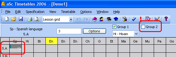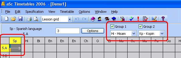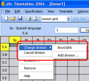 1. Select subject and class by clicking on the corresponding cell. Type 3 as count of lessons per week. Then press right mouse button on the created lesson and select the corresponding division: