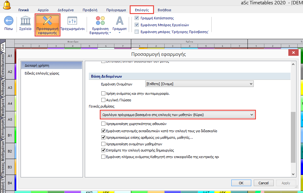 Ωρολόγιο πρόγραμμα βασισμένο στις επιλογές των μαθητών (Κύριο) - εμφανίζει όλες τις αναθέσεις σε μία σειρά, ανεξαιρέτου της τάξης. Αυτή η επιλογή τοποθετεί μαθητές σε ομάδες κατά την δημιουργία του ωρολογίου.
