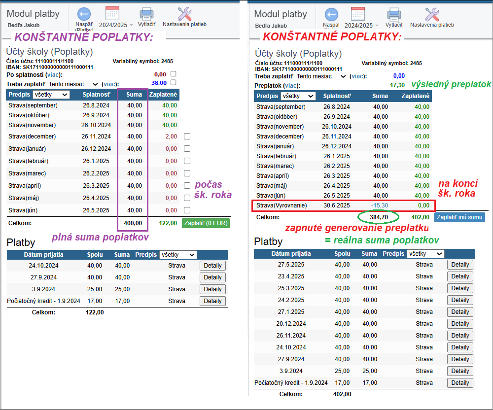 Celkovo pri automatickom predpise nemusíte sami robiť žiadne prepočty - ani na každý nový mesiac, ani na konci za celý šk. rok. Poplatky sa samé upravujú a hradia podľa toho, ako sa stravníci odhlasujú a posielajú platby.