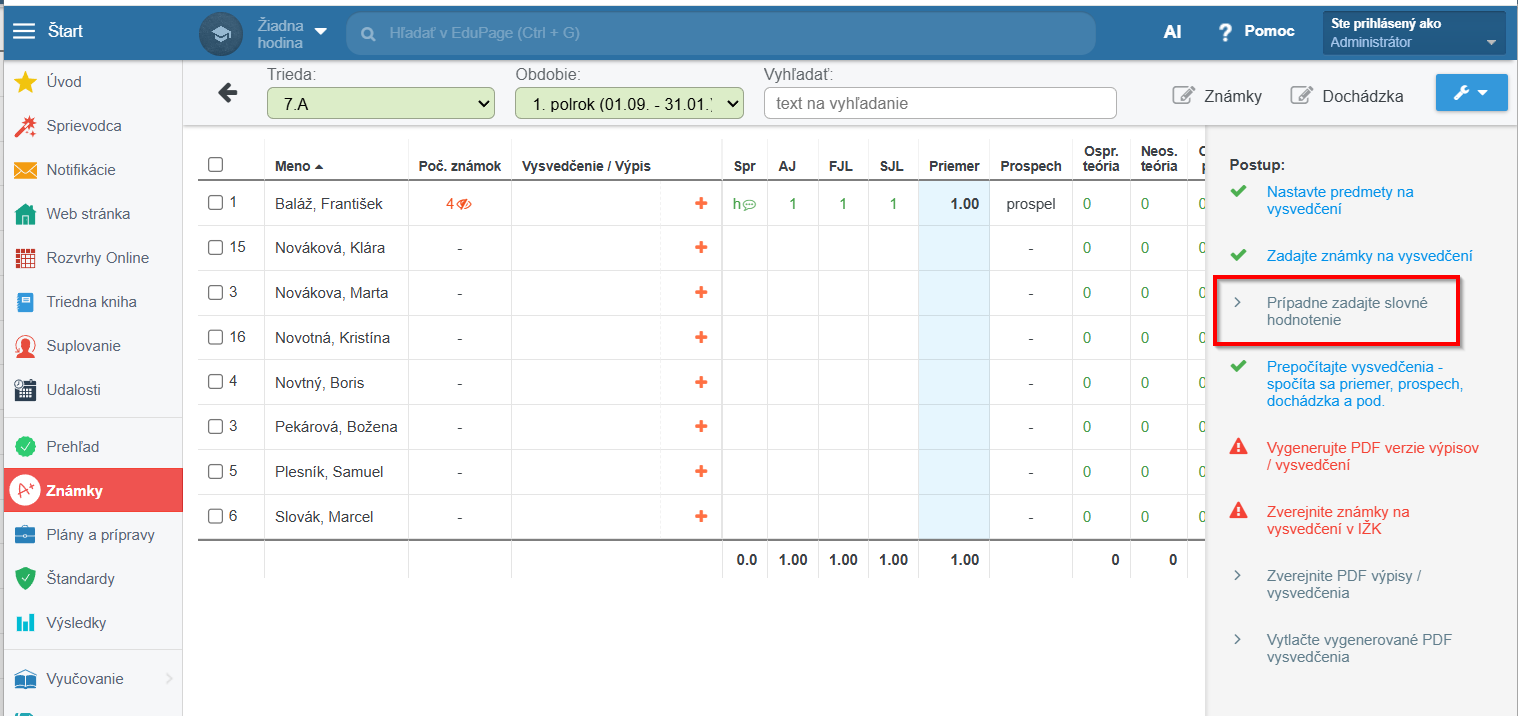 Po označení alebo kliknutí na triedu si v ľavom menu vyberiete možnosť : Prípadne zadajte slovné hodnotenie :