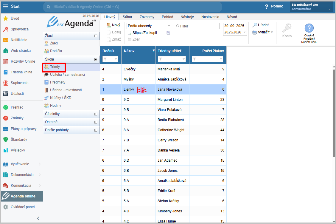 Následne si otvorte v časti Škola - Triedy