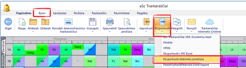 Taip pat galite ją eksportuoti į "Excel". Pasirinkite „Bylos/Eksportuoti/Eksportuoti kabinetų priežiūras“: