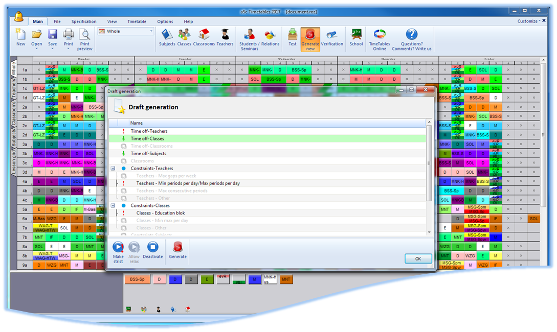 A geração de rascunho foi estendida para melhor ajuda-lo identificar possíveis problemas em seu horário escolar. Agora é possível configurar mais precisamente quais restrições você quer que a geração de rascunho obedeça, ignore ou relaxe. As restrições para os professores e turmas estão divididas em várias restrições que podem ser desativadas ou ativadas individualmente.