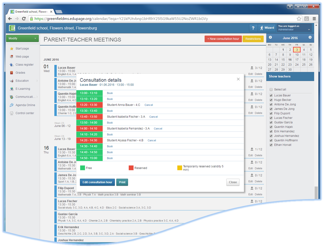 Or you can also organize parent teacher meetings where you or your teachers define when they are available and then parent can book a visit. Various rules can be setup to make sure that each parent can talk to the teacher without any long waiting times: