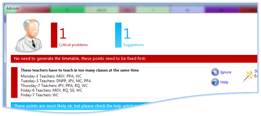 O conselheiro agora pode detectar vários novos problemas potenciais em seu horário escolar antes da geração real começar. O conselheiro é agora capaz de detectar situações onde você tem menos recursos (professores, salas) para cobrir certas partes do horário escolar então necessário.