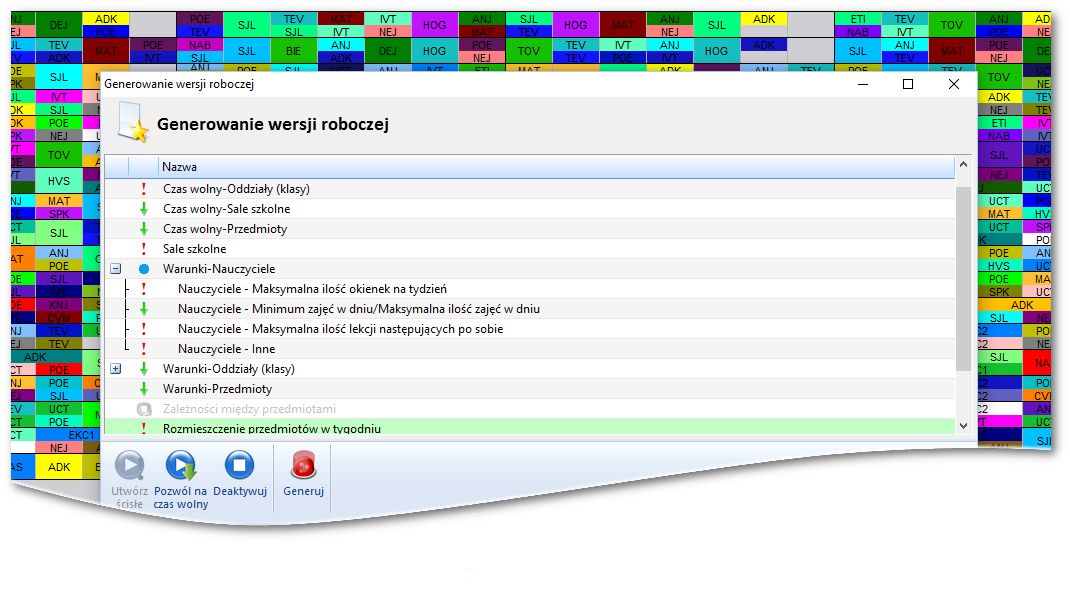 Funkcja roboczego generowania planu lekcji została ulepszona, aby ułatwić odnalezienie potencjalnych problemów jeszcze przed właściwym generowaniem planu. Możliwe jest wskazanie które zależności powinny być ściśle przestrzegane, które mogą zostać złagodzone, a które należy wyłączyć. Zależności dla nauczycieli i klas zostały rozdzielone na kilka osobnych pozycji, które mogą być indywidualne włączane i wyłączane.