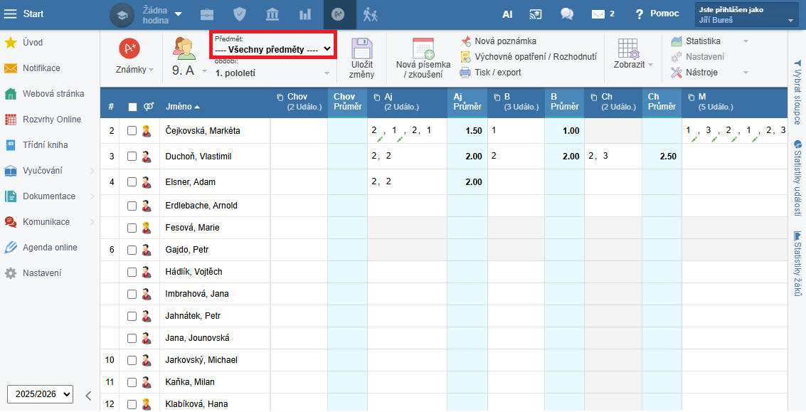 Vyberte svou třídu a v předmětech vyberte Všechny předměty.
