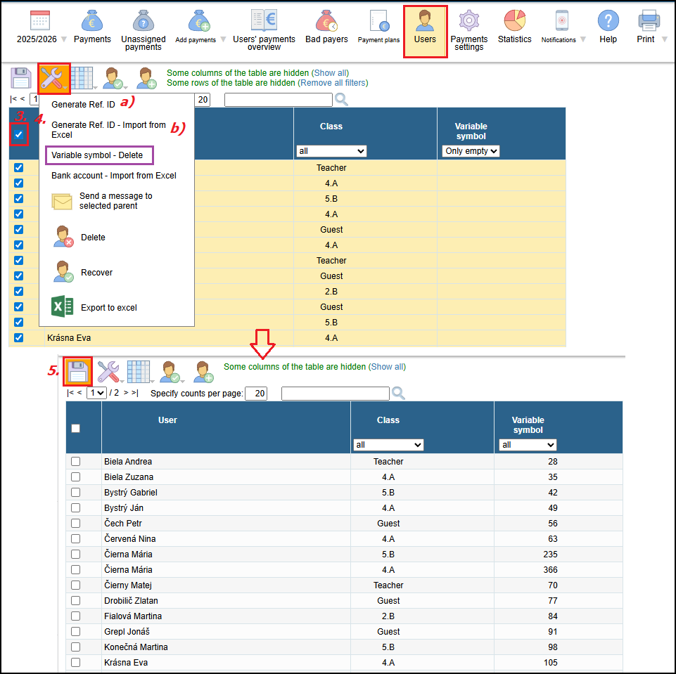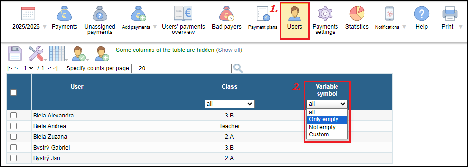 • In the "Users" section it is easy to filter only students without an assigned variable symbol: