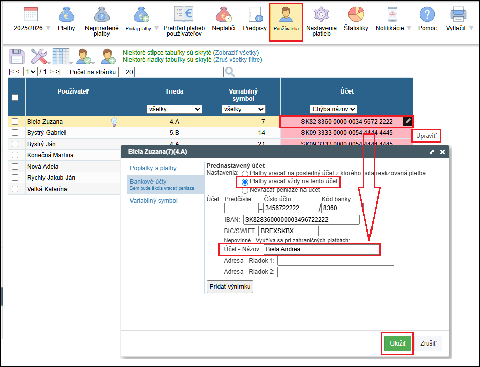 --> jednotlivo - kliknutím na konkrétny IBAN používateľa - vyberieme voľbu Platby vracať vždy na tento účet a napíšeme názov účtu používateľa: