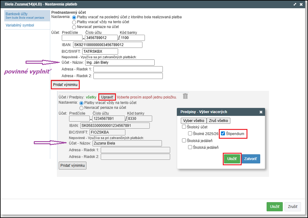 V prípade, že rodič chce vrátiť preplatok z rôznych predpisov na iné bankové účty tak si môže Pridať výnimku, kde je potrebné vybrať si konkrétny predpis, zadať bankový učet a nastavenie Uložiť.