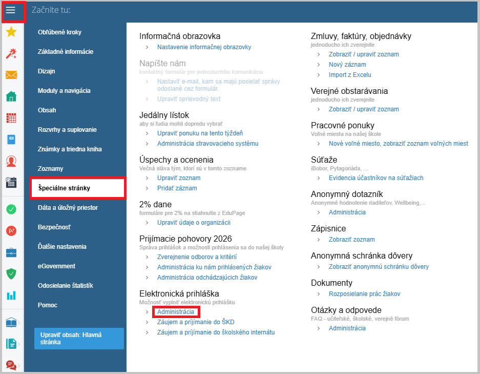 V EduPage v ľavom hornom rohu vyberte "Špeciálne stránky" a Elektronická prihláška "Administrácia".