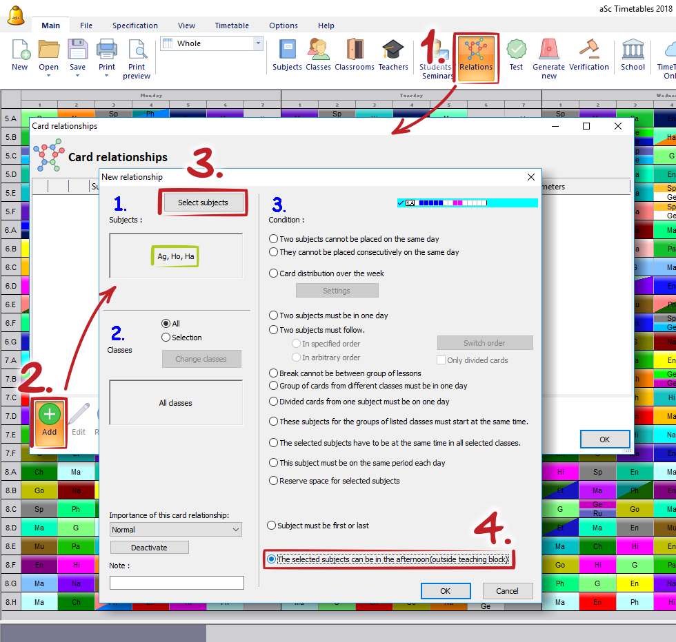 Now the selected subjects can for example be on 8th period, while normal teaching ends at 5th period. Without this card relationship the software will never create 3 period gap for the students.