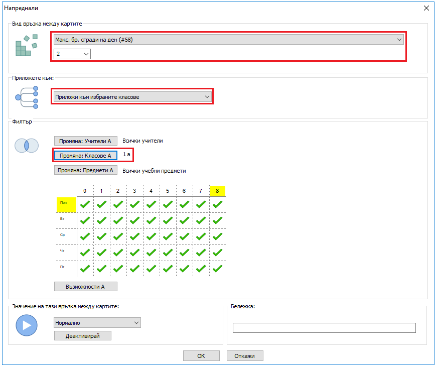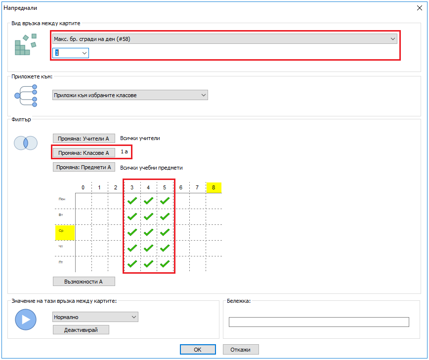 Също така можете да обозначите времева карта за тази връзка в информационната карта. Така, например, тази връзка в картата казва, че учениците могат да бъдат само в една сграда в учебното време за 3,4,5. С други думи, те не могат да се прехвърлят между 3/4 и 4/5 учебни часове: