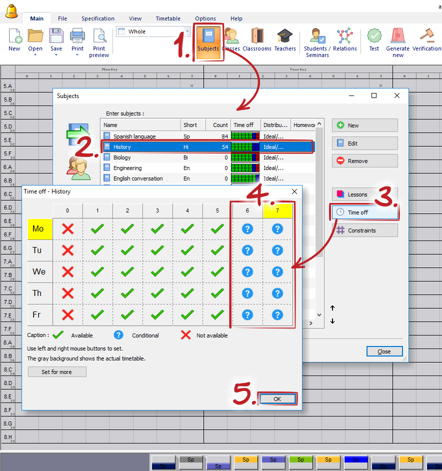 At first, define these questionmarked possitions in "Time-off" for subject.