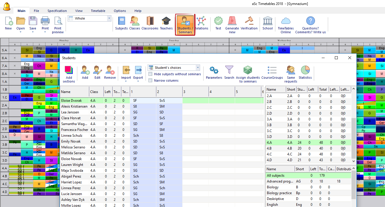 Niekedy však je nevyhnuté vložiť do rozvrhu aj konkrétnych študentov. Každý študent musí byť zadelený v niektorej z tried. Napríklad "Ján Novák zo 4.A"
