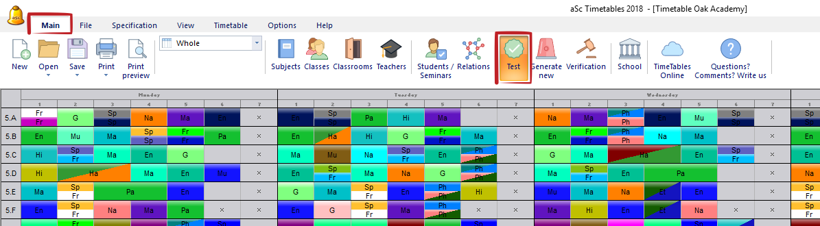 Before you generate your timetable, it needs to pass the basic test. You can find it in main menu as "Test" or in menu "Timetable - Test".