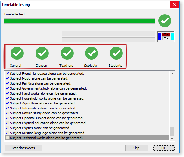 This first test tries to generate small parts of your timetable to detect the basic mistakes in your inputted data or constraints. It will try to generated each item - class/teacher/subject/classroom separately and it checks, if there are not some basic mistakes. Finding these mistakes is very important, because if it is not possible to generate timetable for just one class or one teacher then it will not be possible to generate whole timetable for sure.