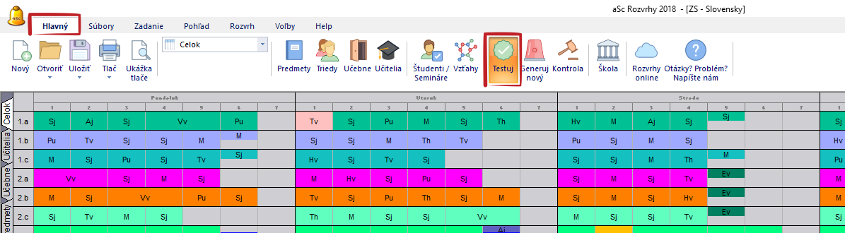 Predtým, než začnete generovať, je potrebné, aby váš rozvrh prešiel základným testom. Túto funkciu nájdete v hlavnej ponuke ako "Testuj" alebo v ponuke "Rozvrh - Testuj".