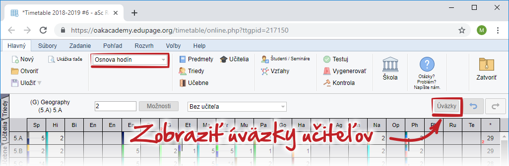 - Predchádzajúci rozvrh (červený prúžok) - či učiteľ učil tento predmet žiakov v minulom roku.