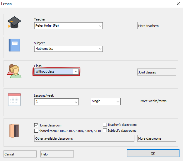 Lessons without class can be used to specify some activities for teachers only. These lessons can cover some administration work, teachers' meetings, preparation time, etc...
