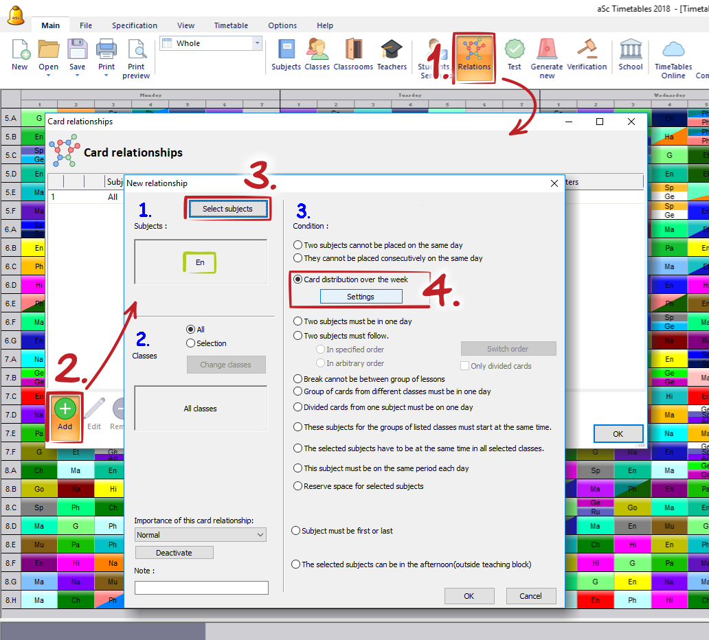 Go to menu Specification/Card relationships/Add, then select subject(s) and class(es). Then choose "Card distribution over the week" and click on "Settings":
