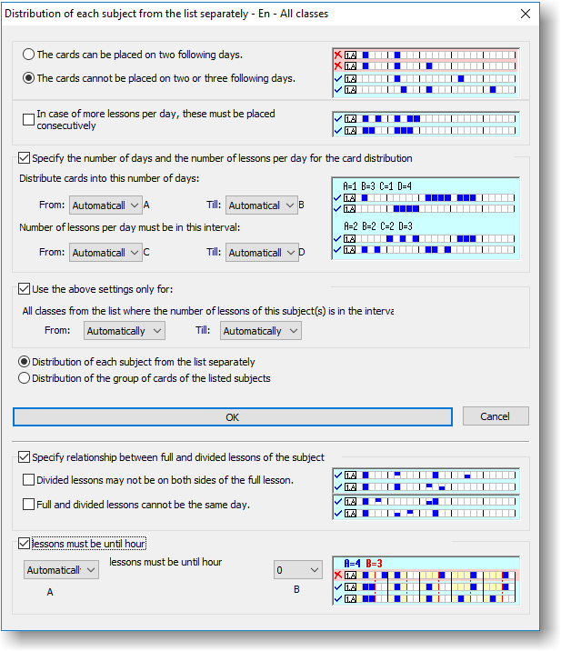 - "Distribution of the group of cards of the listed subjects" can be used to distribute e.g. "Biology" and "Biology lab" subjects together, so it will consider them as the same subject (and will not place them on the same day or consecutive days, e.g.).
