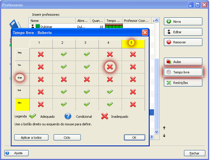 - Todas as aulas tem multiplos Tempo livres - da disciplina, professor(es), turma(s), sala(s). Eles aplicam-se junto, assim se alguma posição for incapacitada em apenas um destes Tempo livres, a posição é incapacitada também para esta aula.