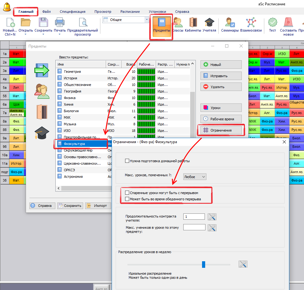 Если вы хотите некоторым предметам это разрешить, можете определить для каждого предмета индивидуально, могут ли двойные уроки этого предмета прерываться перерывом. Вы можете сделать это в окне ограничениях предмета: