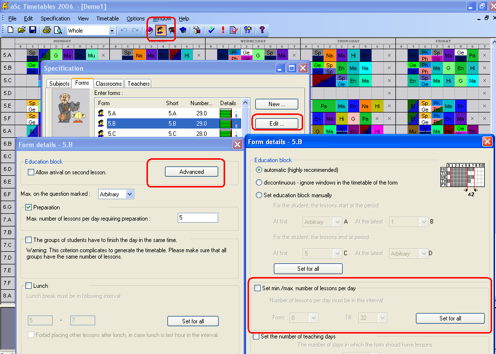 Also wenn Sie den automatischen Unterrichtsblock verwenden, der 6-8 Stunden pro Tag beträgt, dann rechnet die Software nicht 9 Stunden pro Tag aus. Aber Sie können begrenzen, dass Sie max. 7 Stunden pro Tag möchten. In Menü - Eingabe - Klassen - Details - Erweitert:
