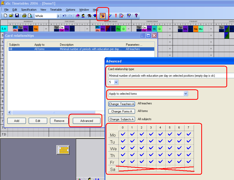 In diesem Fall benutzen Sie die Erweiterten Zusammenhänge zwischen Karten, die die min. Stundenanzahl pro Tag begrenzen und einzelne Tage bestimmen. Sie wollen z.B. min. 5 Stunden jeden Tag von Montag bis Freitag haben: