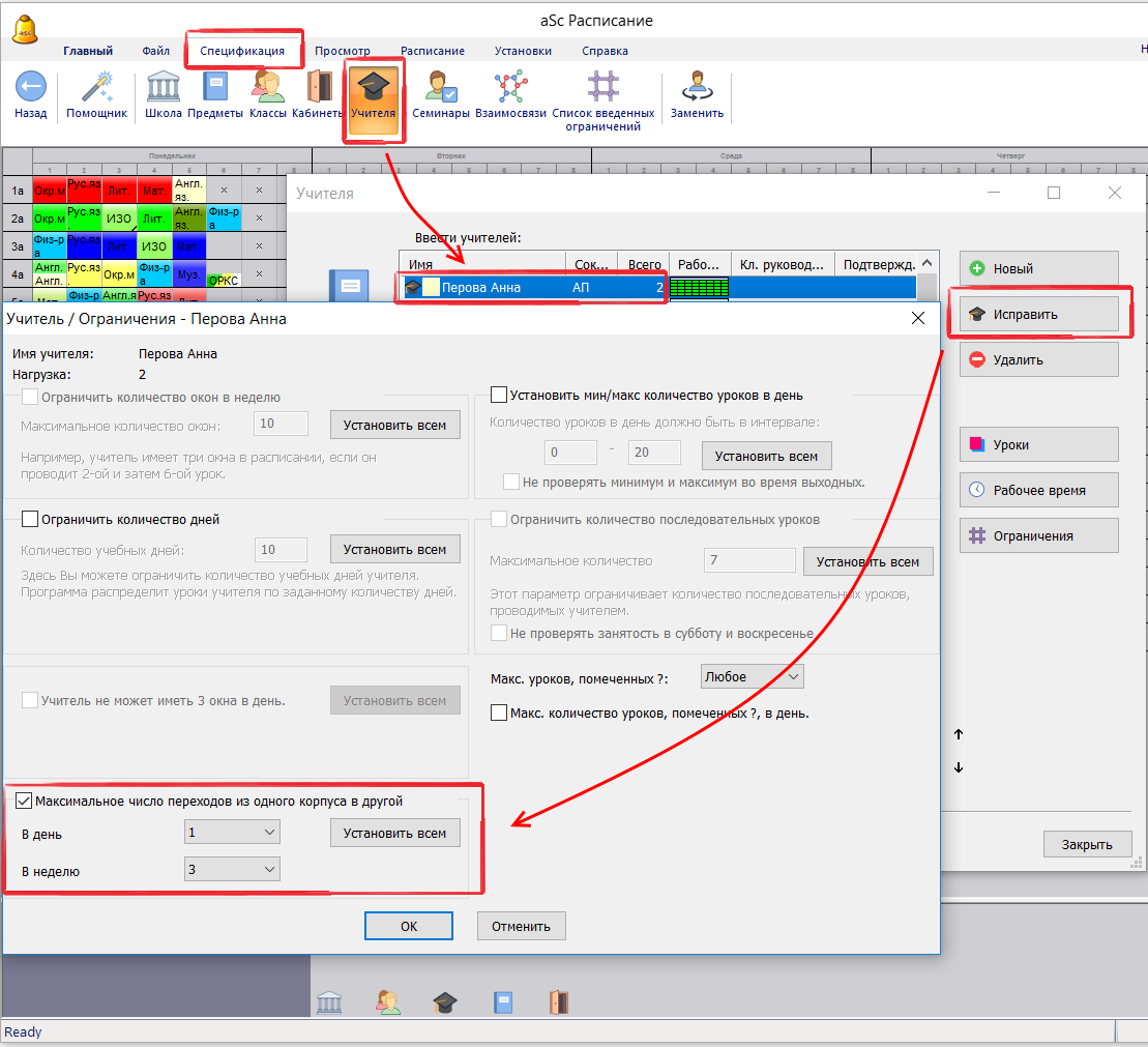 2) Сколько времени занимает переход в другое здание. Если Вы ввели "1", это означает, что учителю нужен 1 свободный урок для того, чтобы перейти в другое здание (место). Если Вы ввели 0, это означает, что здания находятся очень близко, и он может перейти в другое место в течение перерыва между уроками.