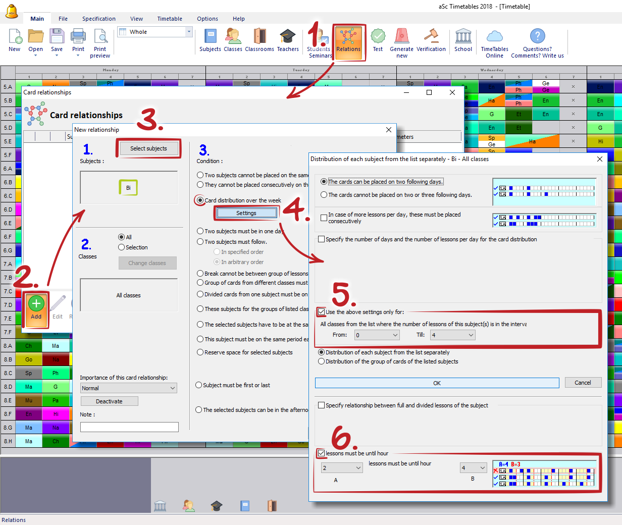 For example this picture defines a cardrelationship for all classes that have 1,2,3 or 4 biology lessons. For these classes the generator shall always place at least 2 lessons before 4th period: