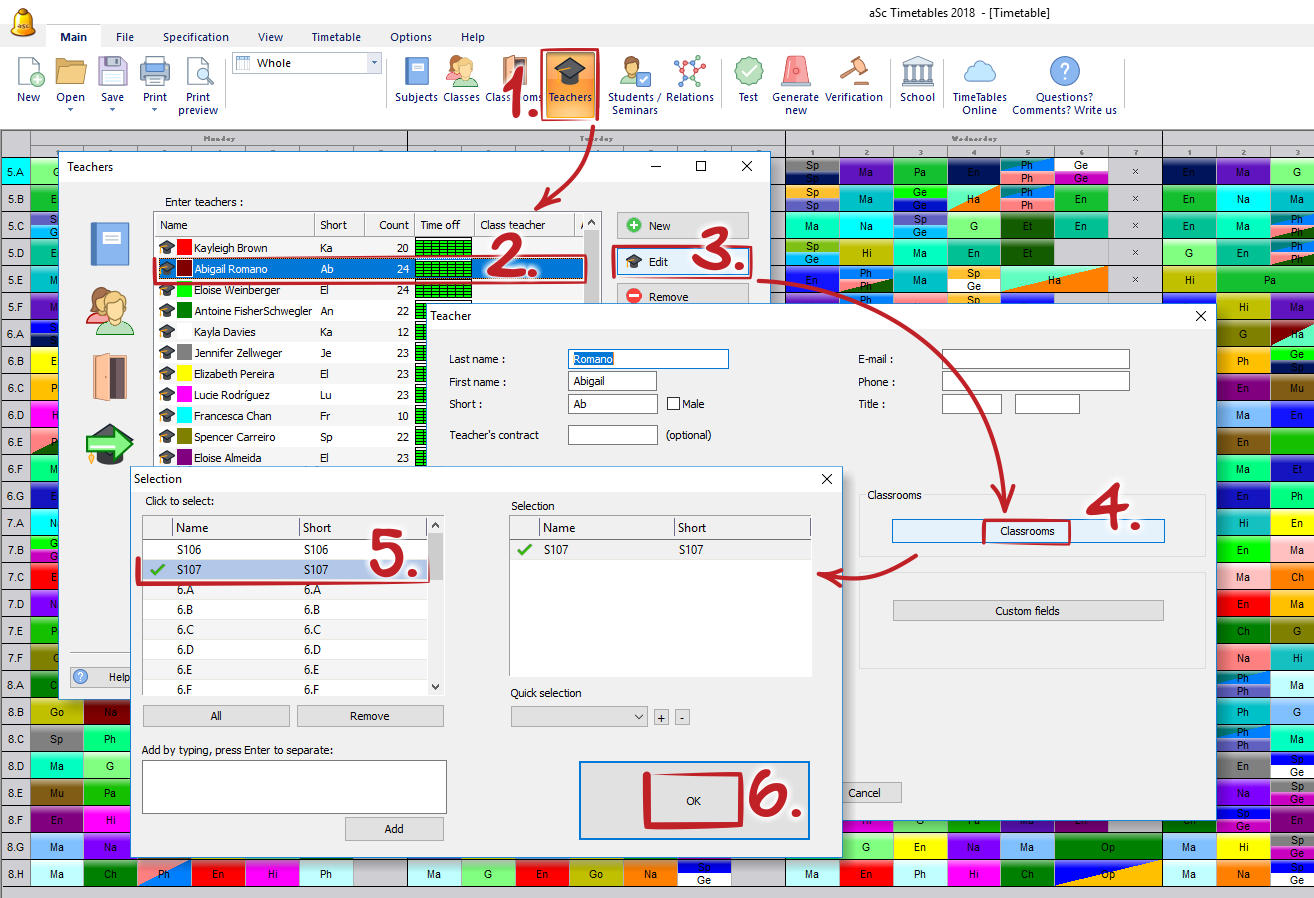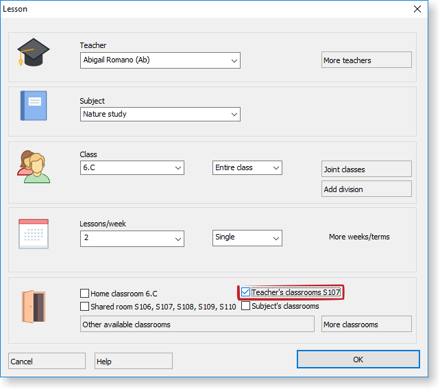 Note: if the subject has own classrooms then these are taken as priority and teacher's classrooms are not taken into account by default. So for example if teacher is teaching History in his room and he also teaches Physical Education then PE lessons will by default be only in Gym rooms defined by the subject. Again this can be changed by you at anytime.