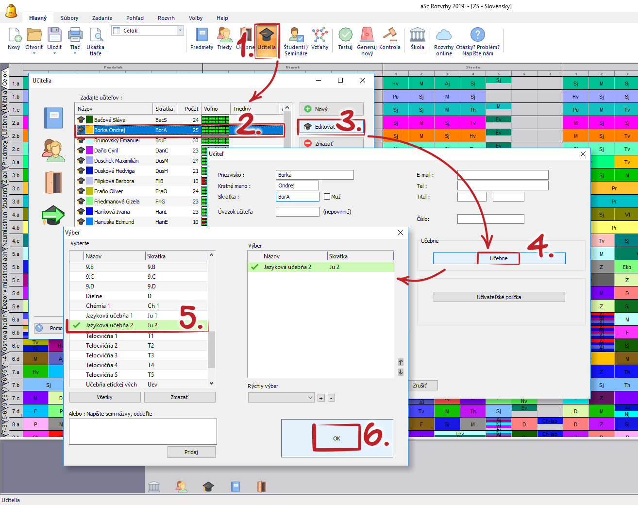 Poznámka: Ak sú priradené učebne aj k predmetu hodiny, potom sú prioritne vyberané tieto učebne a nie učiteľova učebňa. Napríklad, ak učiteľ učí dejepis vo svojej učebni a taktiež učí Telesnú výchovu, potom TSV bude priradená iba do telocvične ako učebne predmetu a nie do učebne dejepisu - teda učiteľovej učebne. Samozrejme toto môžete kedykoľvek zmeniť a vybrať vlastnú preferovanú učebňu.