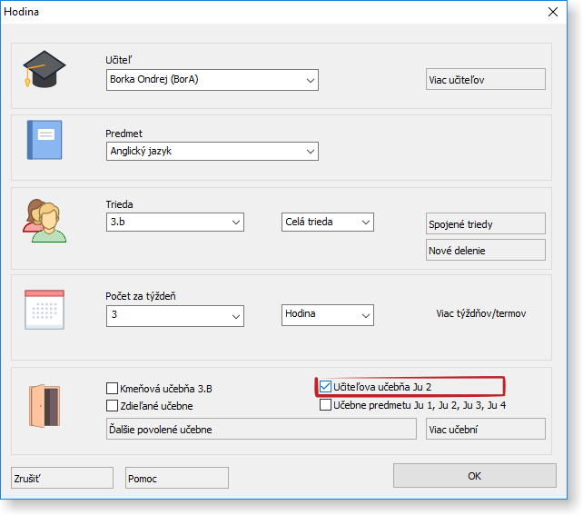 Táto možnosť je automaticky vyznačená ak vytvárate hodinu pre učiteľa, ktorý už má definované svoje učebne. Samozrejme, môžete zadať aj iné učebne.