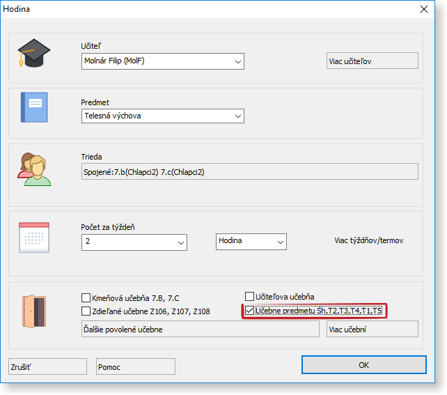 Napríklad - ak ste už vytvorili hodiny Telesnej výchovy, kde ste zaškrtli "Učebne predmetu", po pridaní novej učebne k učebniam predmetu TV, bude táto učebňa automaticky povolená pre všetky hodiny s týmto nastavením.