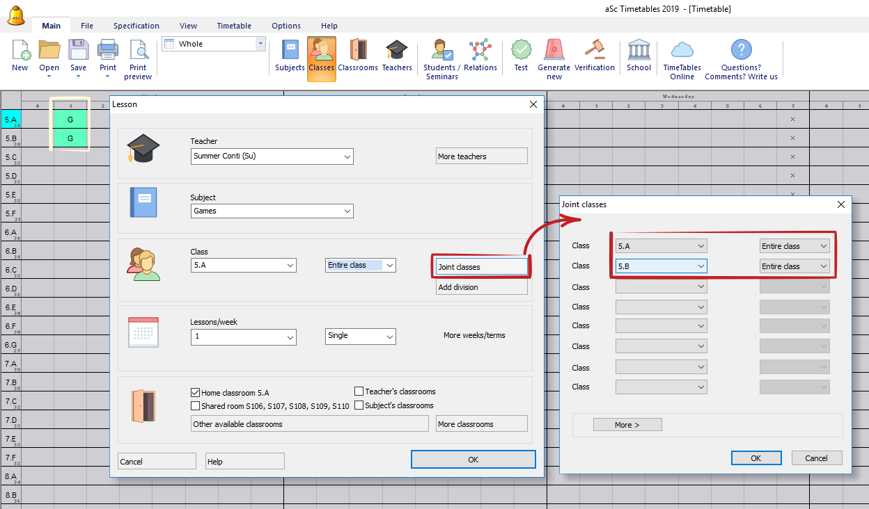 Na zadanie takýchto hodín slúži tlačítko "Spojené triedy" v dialógovom okne "Hodina".