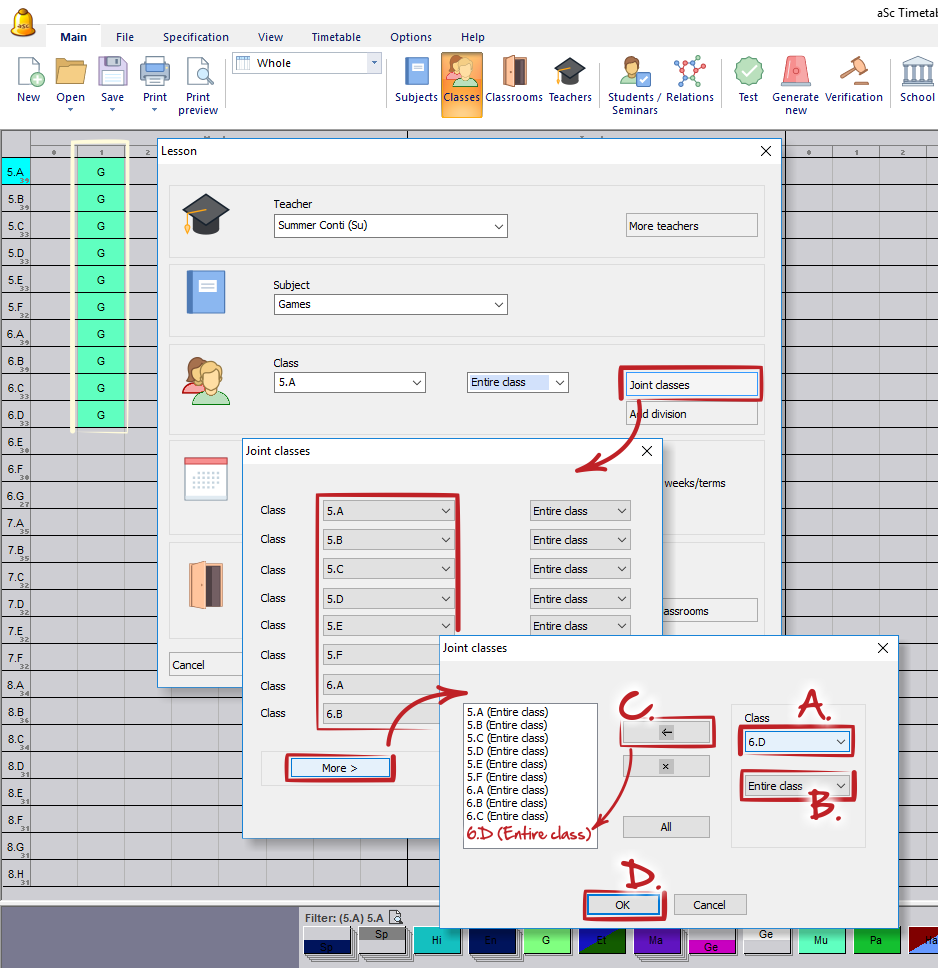 Pre rýchly výber tried máte k dispozícii 8 políčok. Ak potrebujete zlúčiť viac tried, kliknite na tlačidlo "Viac" a pridajte ďalšie triedy opakovaním krokov A-B-C. Finálny výber tried a ich skupín potvrdíte tlačidlom "OK" (D).