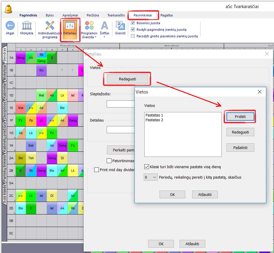 Pastaba: Šios informacijos į programą įrašyti nereikia, jeigu Jūsų mokymo įstaiga yra tik viename pastate arba sudarant tvarkaraštį nėra svarbu, kad vyksta perėjimai į kitą pastatą.