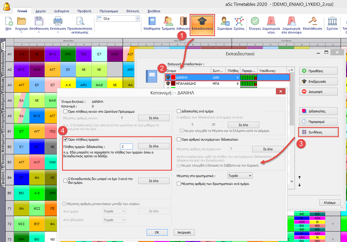 Κατευθυνθείτε στο μενού Γενικά/Εκπαιδευτικοί/Συνθήκες. Το πρόγραμμα θα επιλέξει τις καλύτερες μέρες ανάλογα με τον αριθμό που θα ορίσετε.