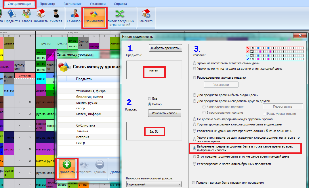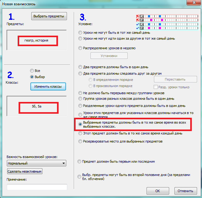 2) Если Вы хотите такое ограничение и для уроков английского языка, Вы должны создать новую взаимосвязь. То есть Вы будете иметь одну взаимосвязь для математики и одну для английского языка. Если Вы выберите два предмета в одной взаимосвязи, она будет иметь другое значение, см. 3.