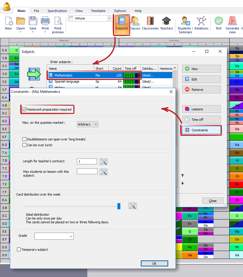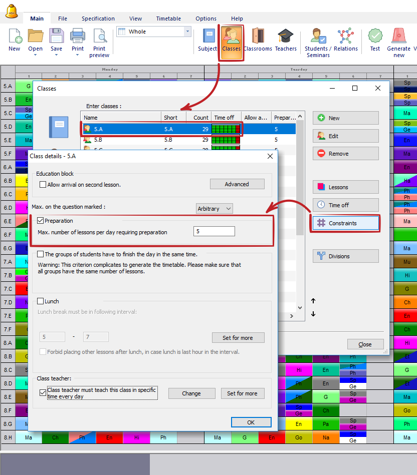You can then specify the maximum number of these subjects that can be taught in one day. You can specify this individually for every class: