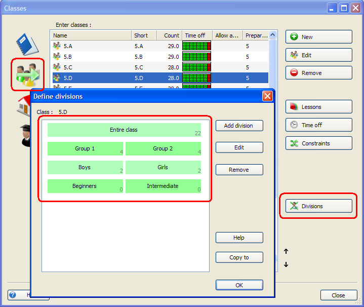 ניתן למחוק חלוקות, במקרה זה כל השעורים שהוגדרו עבור החלוקות האלה יימחקו גם כן.