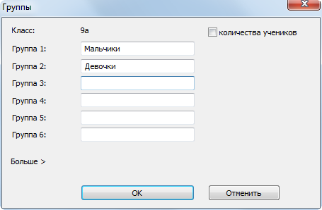 Например: Физкультура - 2 раза в неделю для группы мальчиков. Или английский - 3 раза в неделю для преуспевающей группы. Или математика - 3 раза в неделю для целого класса, так как целый класс - также группа.