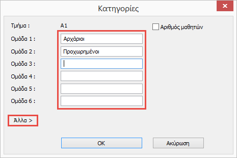 Μπορείτε πάντα να δημιουργήσετε καινούργιες κατηγορίες, π.χ. κατηγορίες αποτελούμενες από τα επίπεδα των μαθητών ή άλλα κριτήρια